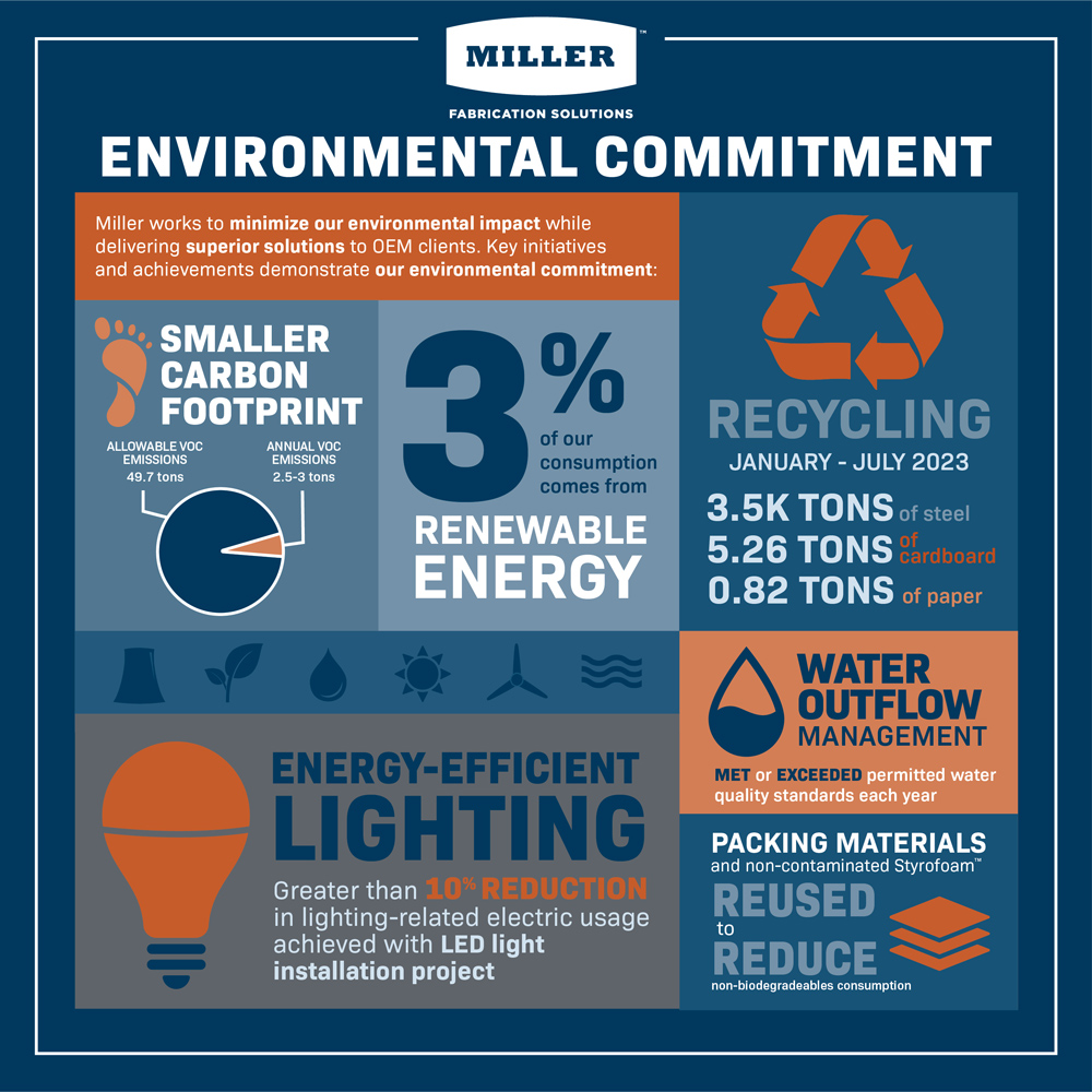 Like many companies, Miller Fabrication Solutions increasingly recognizes the importance of following sound environmental practices. We consistently work to minimize our environmental impact while delivering superior solutions to our OEM clients.